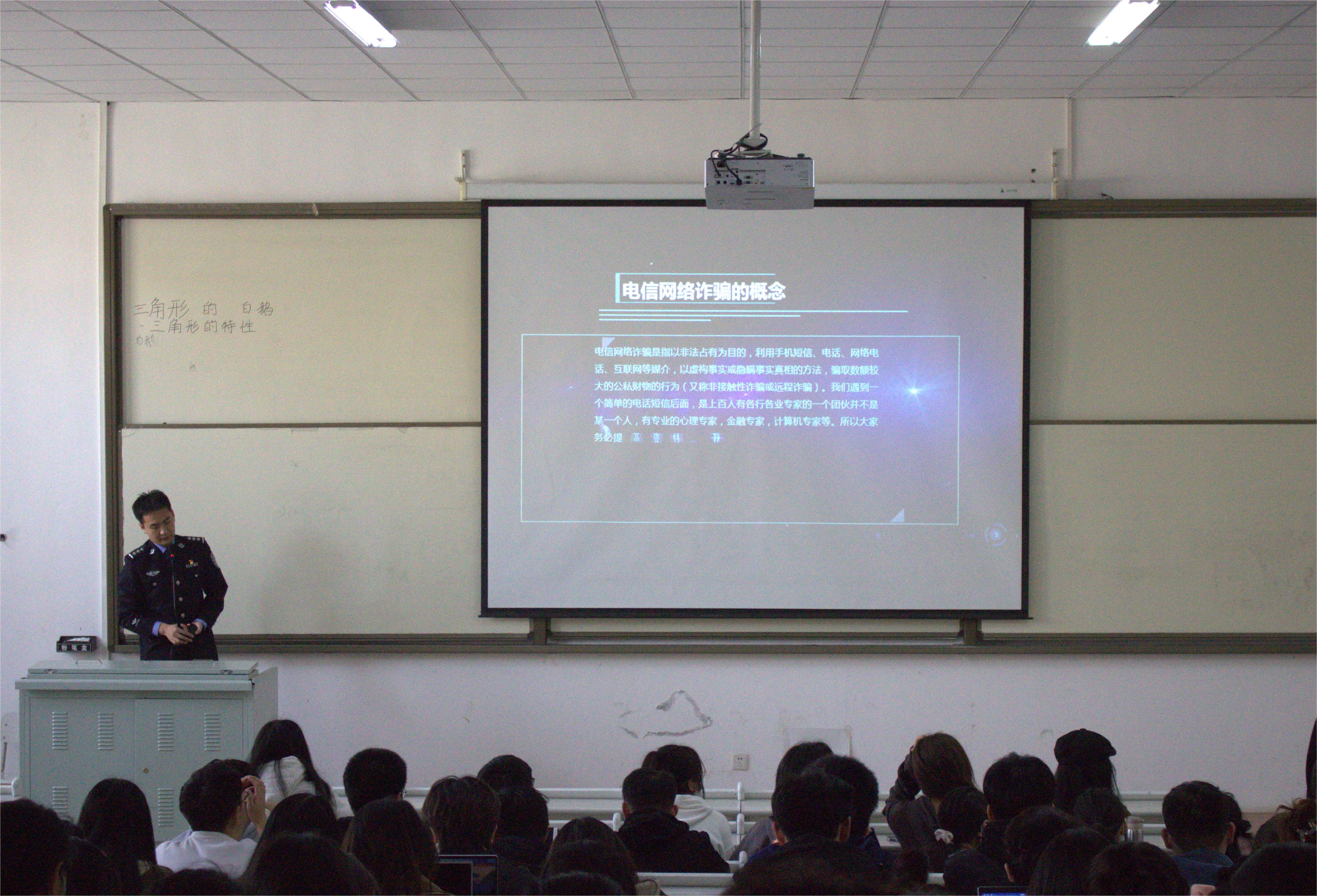 马警官从三个方面为同学们做了宣传教育。首先,他从频发的电诈案例和层出不穷的诈骗手段中梳理出大学生常常遇到的十几种电诈形式,例如被冒充好友诈骗、钓鱼网站、网络借贷、虚构中奖等,引导学生认清诈骗手段,通过安装反诈APP谨防诈骗;其次,马警官从网络舆情角度倡导全体学生在网络上理性发言,共同营造清朗的校园网络环境;最后,马警官从维护国家安全角度提倡同学们要不断增强国家安全意识,进一步维护国家安全,做新时代文明守法的大学生。