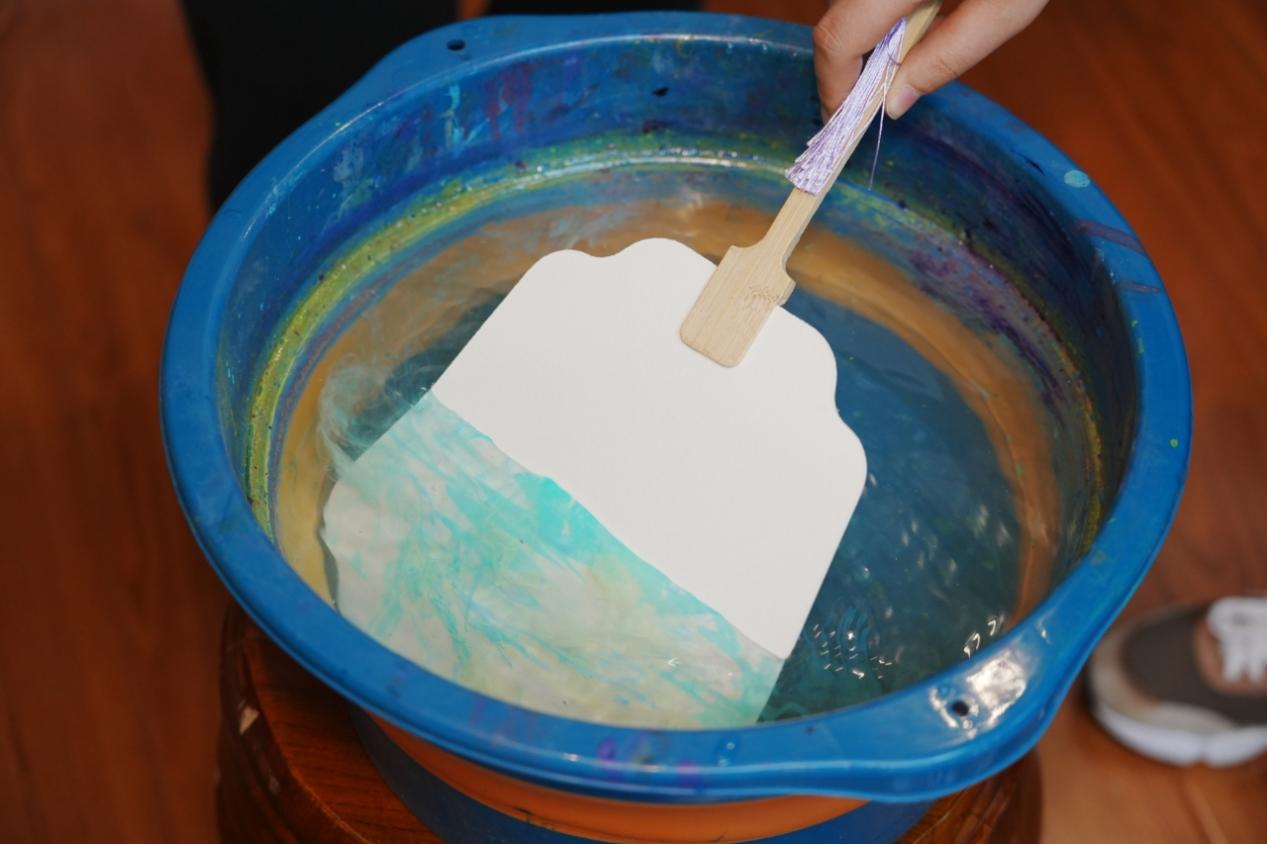 随后,活动进入非遗漆扇制作体验环节,大家在水桶中加入大漆并将各自漆扇等物品放入其中旋转或抖动,最后将制作好的漆扇拿出,独具特色的漆扇制作完毕。参与者近距离接触非遗,在动手体验的同时满足对非遗文化的好奇感。在大漆与水的艺术中,感受色彩给予物体不一样的交融之美。