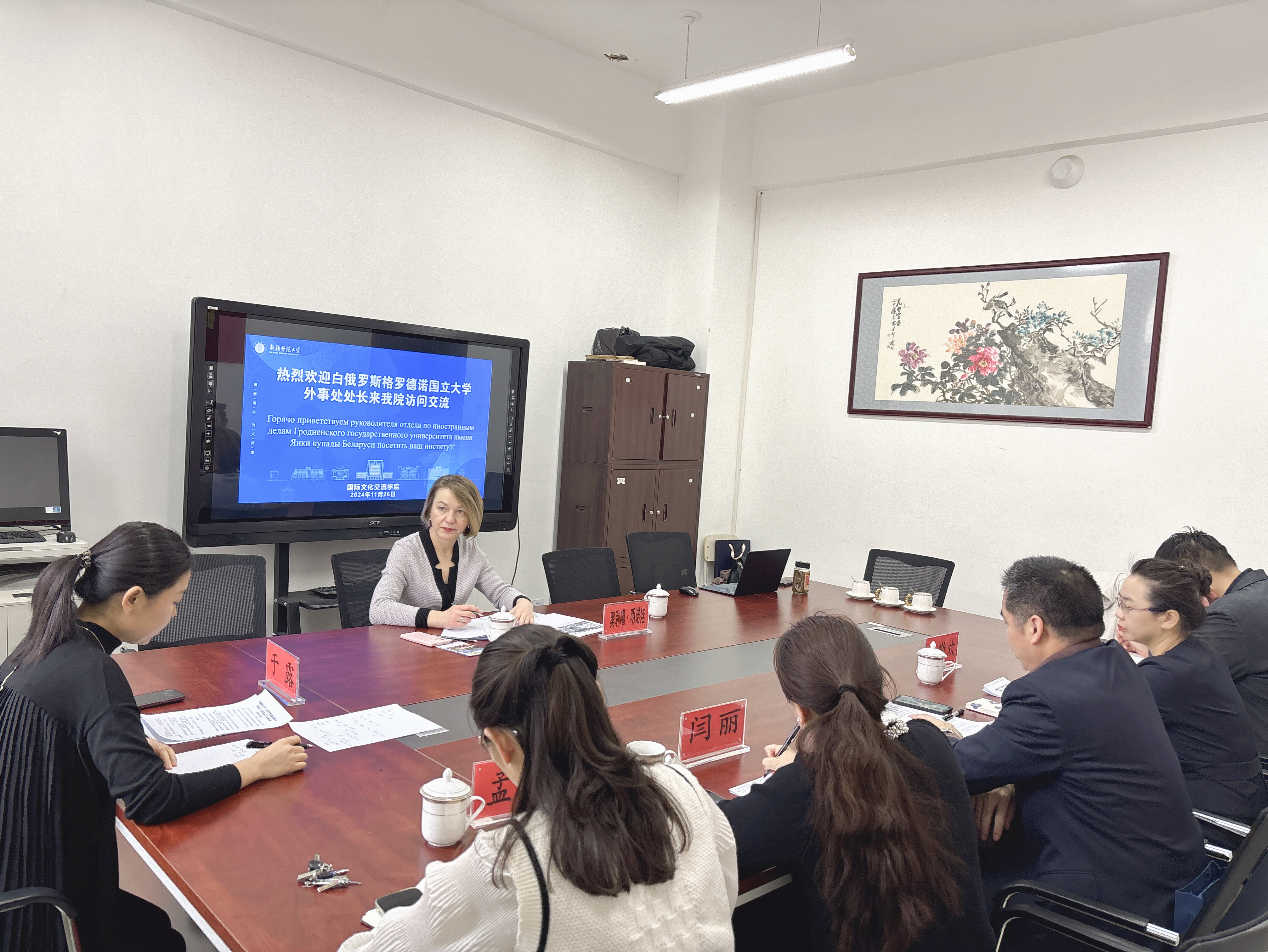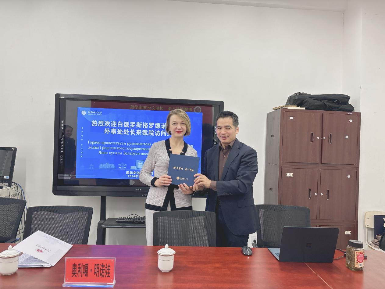 11月26日,白俄罗斯格罗德诺国立大学外事处处长奥莉加·明诺娃女士到访我院,双方围绕在白俄罗斯格罗德诺国立大学建立孔子学院及实习实践基地等事宜进行交流洽谈。