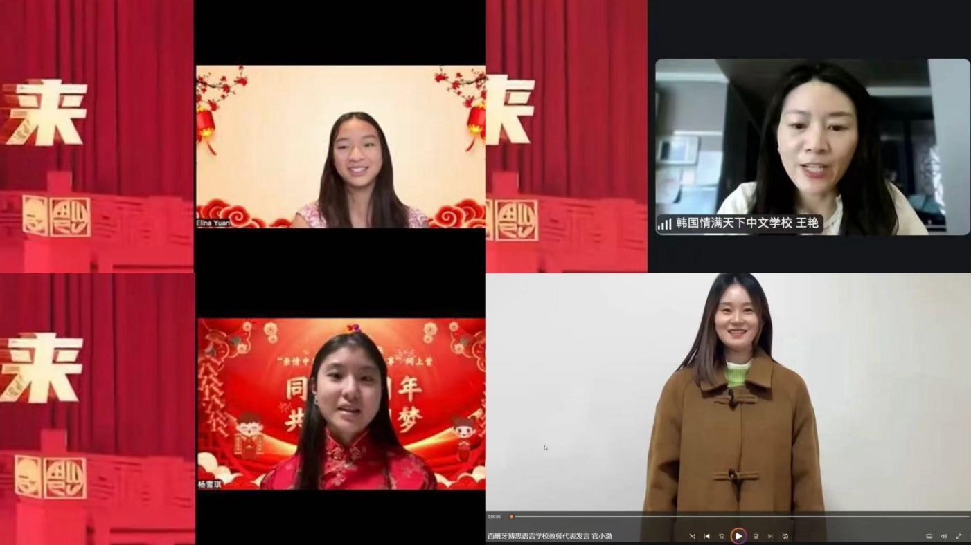 首先,嘉宾与师生共同观看和聆听了中国侨联万立骏主席的新年致辞。万立骏主席表达了对广大侨胞的深切关怀和美好祝愿,指出侨联将始终坚持为侨服务,关心关注侨胞所思、所想、所期、所盼,当好桥梁纽带,并激励侨胞们满怀希望、拥抱未来,共同迎接阳光普照、欣欣向荣的新一年。随后,王艳校长表达了对活动的热烈祝贺,指出本次活动不仅是在传播中国文化,更是在播撒文化认同的种子。西班牙博思语言学校官小渤老师通过视频发表了感言,希望孩子们通过活动了解春节、了解中华文化,了解新疆之美、新疆之大、新疆之奇。加拿大Link CC青年会首席执行官Elina Yuan、特别活动副总裁杨雪琪代表营员分享了自己对中华文化的理解和热爱,以及对此次文化体验的满心期待。