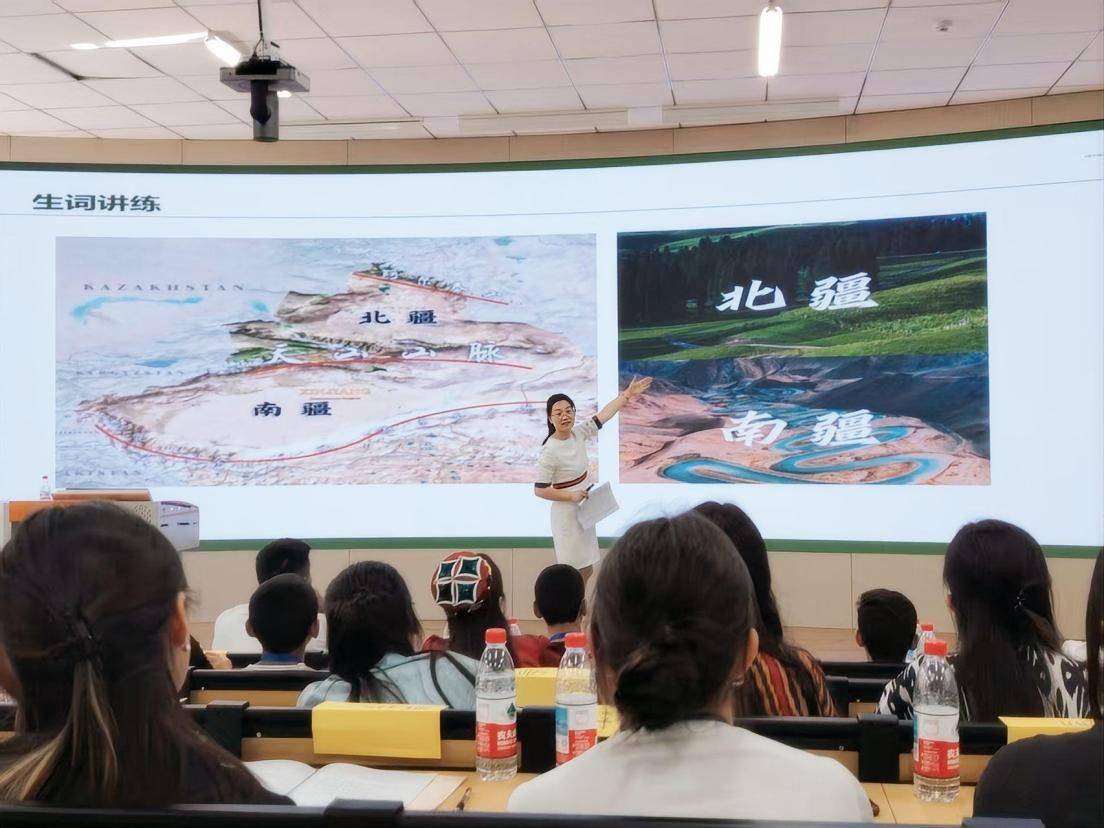 开班仪式后,闫新艳副教授以《初遇·新疆》为主题开启首堂文化课。课程通过“对话+体验”的模式,带领学员探秘新疆地理奇观,解码丝路历史文脉,品味多元艺术瑰宝。在互动环节,学员用刚学的汉语词汇描述初见新疆的感受,现场洋溢着跨文化交流的融融暖意。