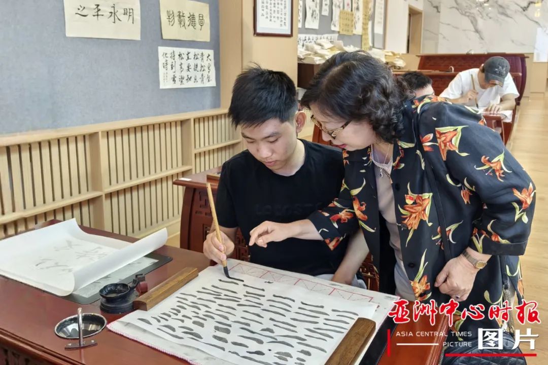 在书法教室,擅长书法的张华中和张丽丽两位政协委员和留学生一起握住了毛笔,凝神静气、提笔挥毫,遒劲有力的字跃然纸上。一旁的吉尔吉斯斯坦留学生马飞的眼神紧紧追随着委员的笔锋,毫不掩饰对这门古老艺术的向往与追求。马飞说:“一定好好练习,以后我也想写得这样好!”一横一竖,一撇一捺,毛笔在纸上行走,中华文化的种子也在无声中悄然播撒生根。